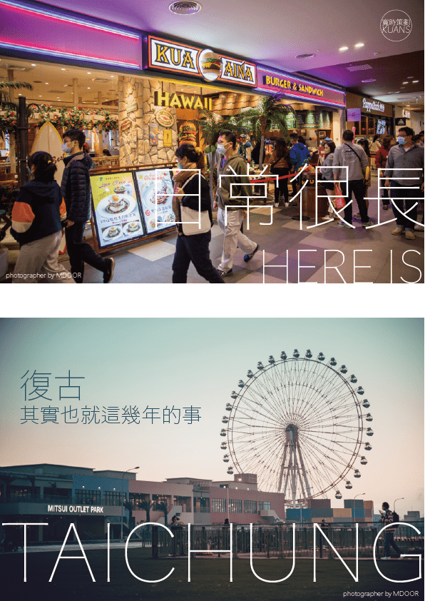 攝影師MDoor在那個時間點跟我們一起合作拍下了這些寶貴的照片,每一個景,都是一個生活紀錄的側寫,紀錄商用房地產在台中,仍有很多應用上的創新值得期待,人性都很相像,我們總會希望在城市的角落、店面的街角,去找尋一個新穎的東西…包含在這個日本三井投資的港區摩天輪OUTLET,其實回看當時還在草圖時候的階段,摩天輪都是很浪漫的存在,在都是工業、外銷為主的台中港,要創造一個這樣的想像,也是蠻有趣的…
